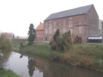 In early 1917 the ruins of this building known as the Steam Mill were occupied by the Germans, with the British lines on the opposite side of the canal. The German trenches were some 50 yards from the canal bank. The banks of the Yser Canal here were then linked by a broken railway bridge (now the road bridge over the canal) across which from time to time, both sides sent raiding parties. Edmund Blunden who was in the line here in January 1917 with the 11th Sussex, reported that units of the Belgium Army were holding the banks of the canal on their left and were frequently under mortar fire from the enemy posts occupying the Steam Mill and the trenches nearby.